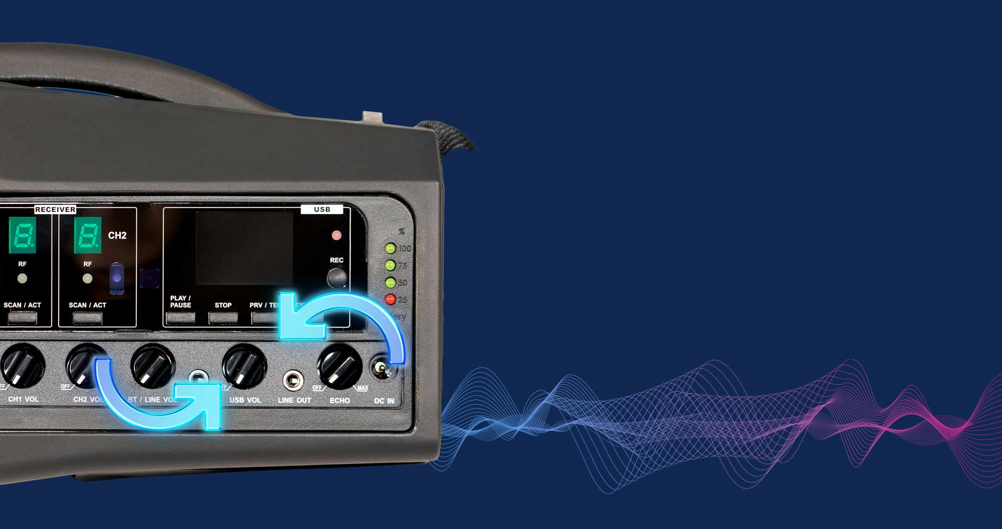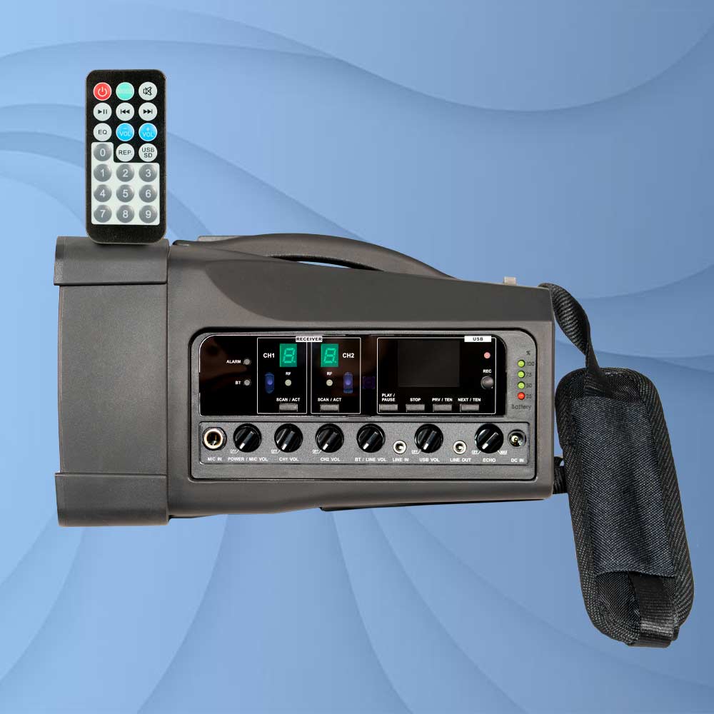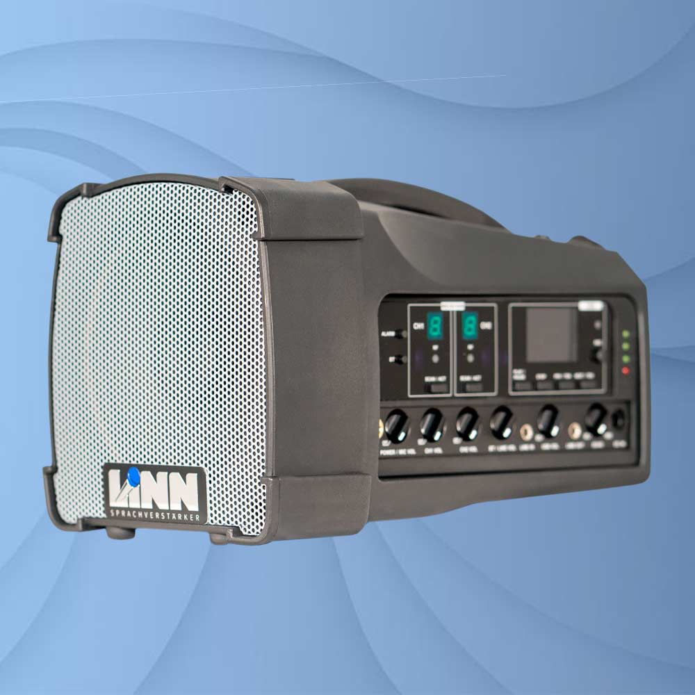 Mit diesem professionellen Gerätesystem haben wir eine besonders kompakte und handliche Beschallungsanlage geschaffen, die trotz kleinster, hocheffizient arbeitender Bauteile mit bis zu zwei Sendermikrofonen betrieben werden kann. Die Stimmverstärkung überzeugt durch eine glasklare Wiedergabe, dies selbst aus einer weiten Distanz von bis zu 100 Metern von den Anwendern zum Lautsprecher.